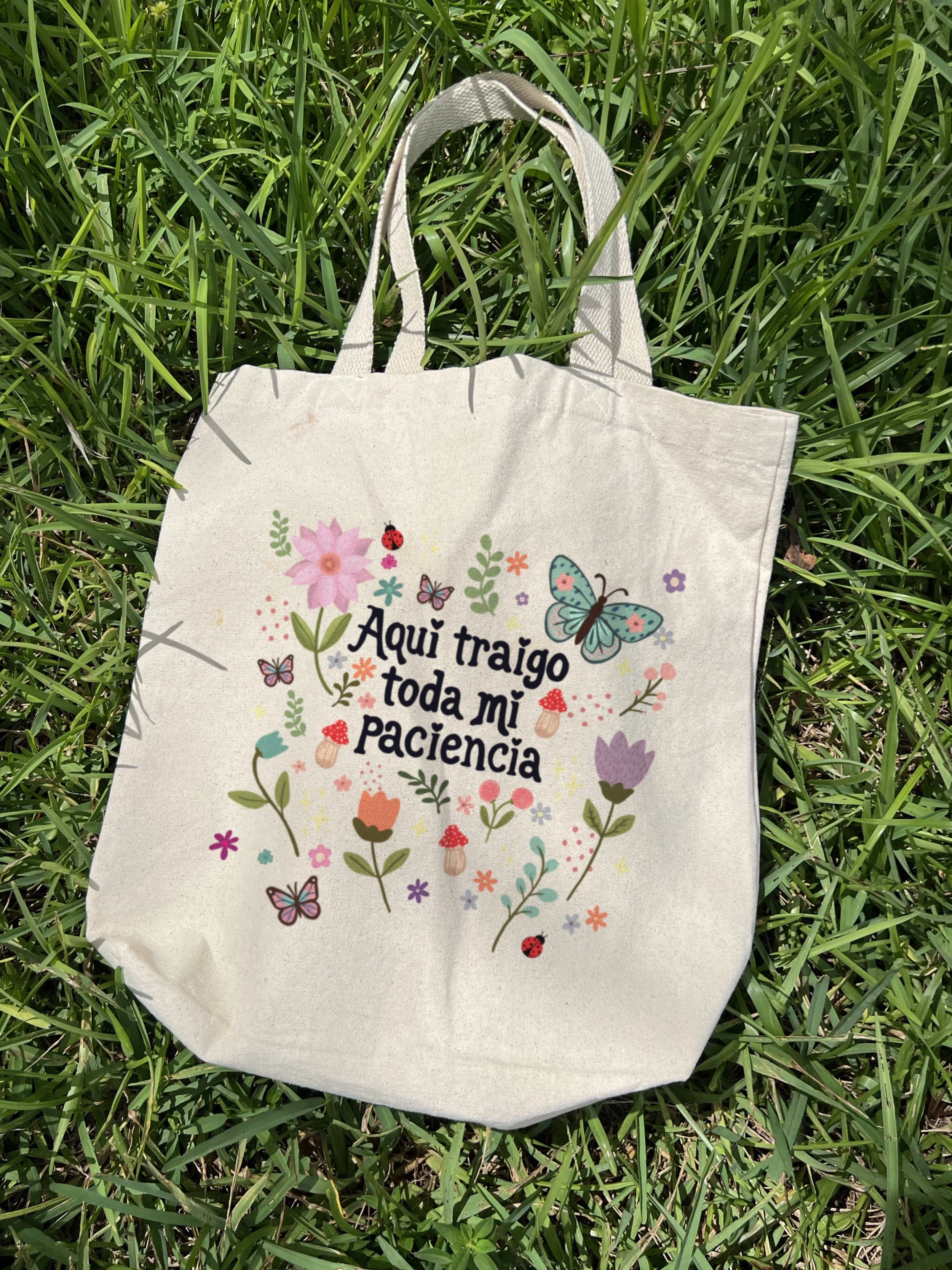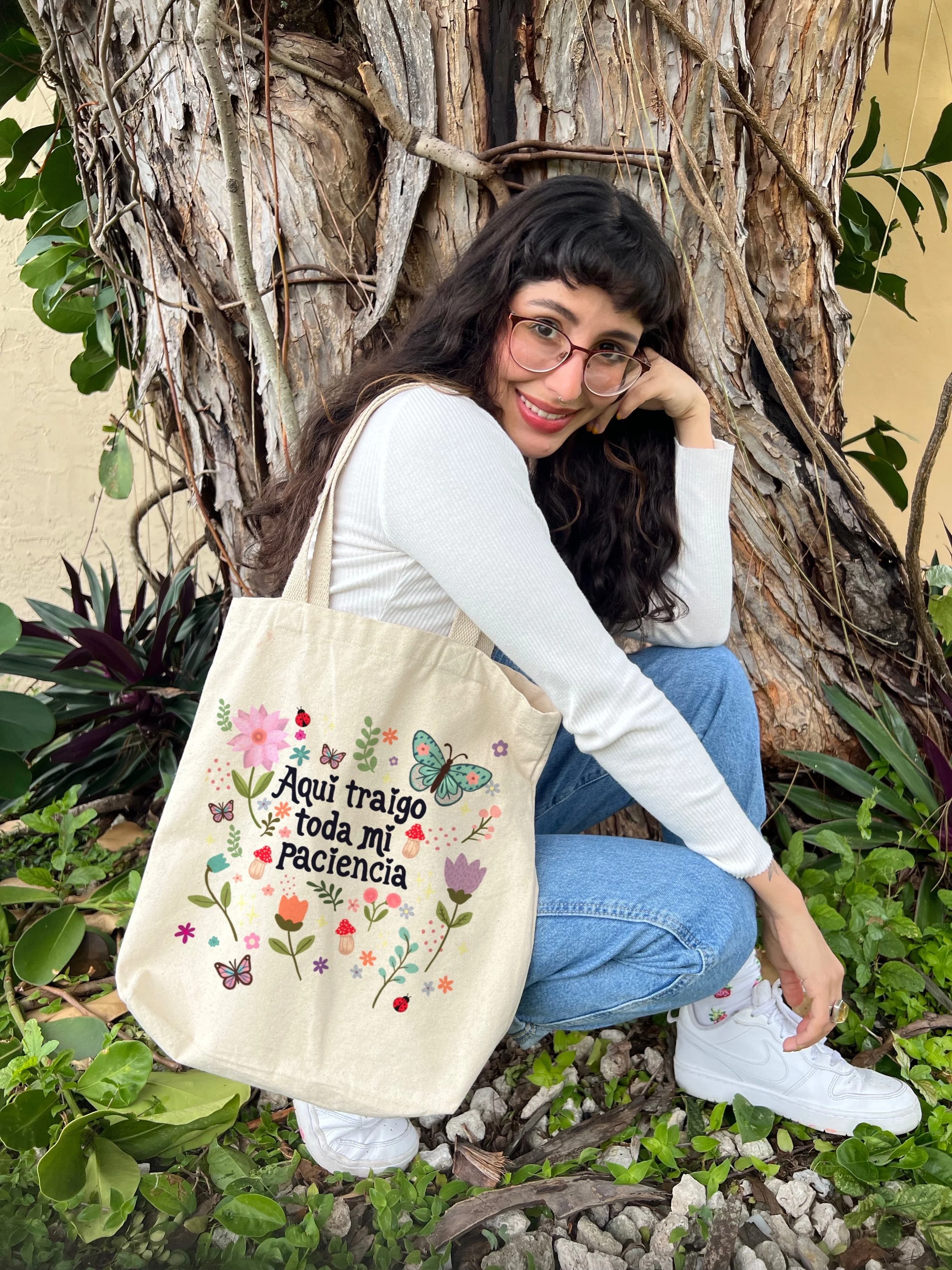 Acá no hay perfección, hay intención. Como mi primer tote bag: “Aquí traigo toda mi paciencia” , una frase que pensé mil veces mientras cargaba pañales, snacks, y emociones.
